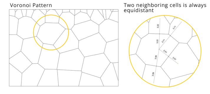 Voronoi is a geometrical pattern generated based on points within a boundary.